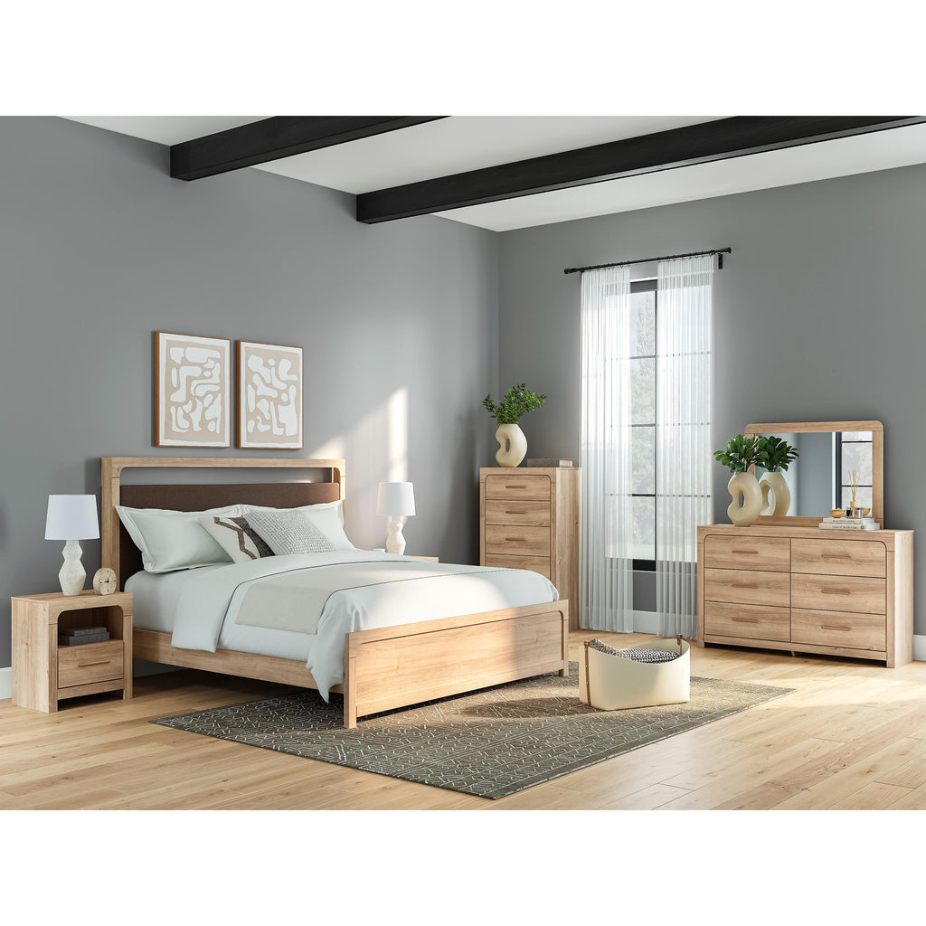 • Includes upholstered panel headboard, panel footboard, platform rails and roll slats