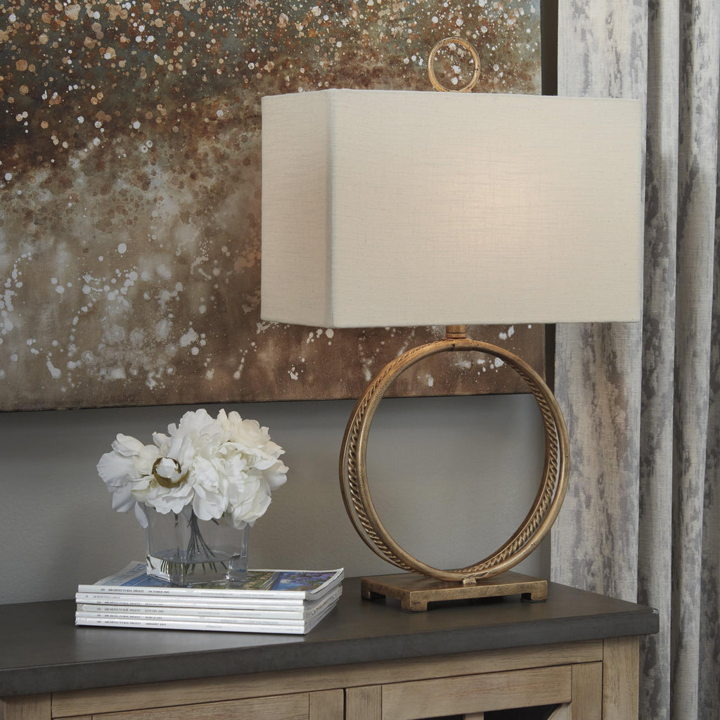 • Made of antiqued goldtone metal with rectangular hardback shade