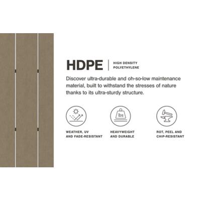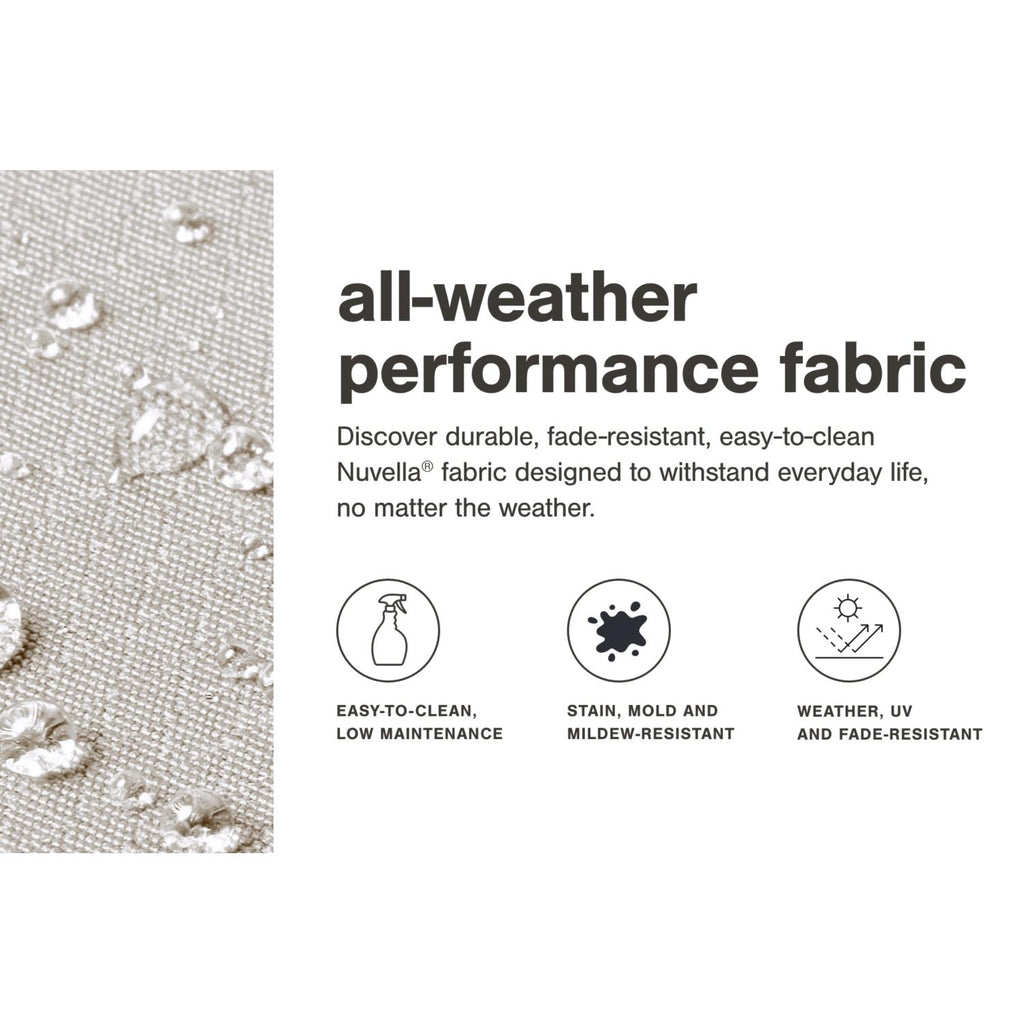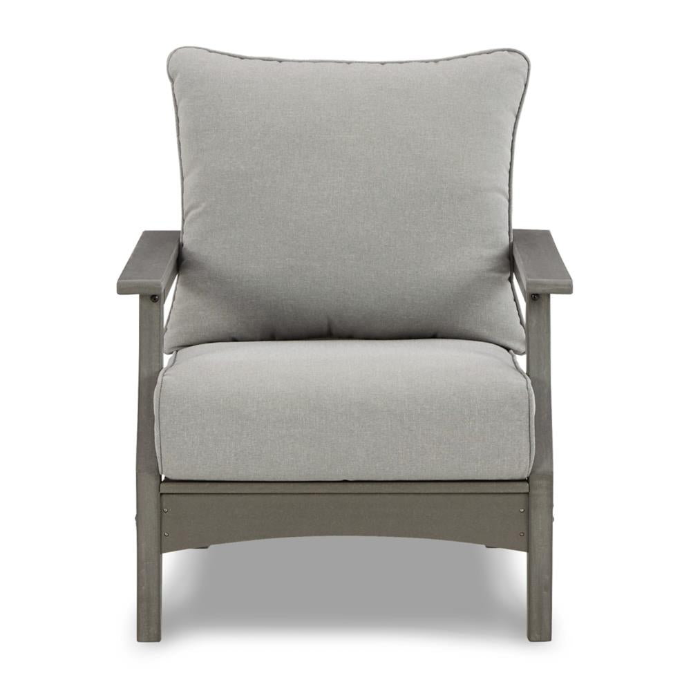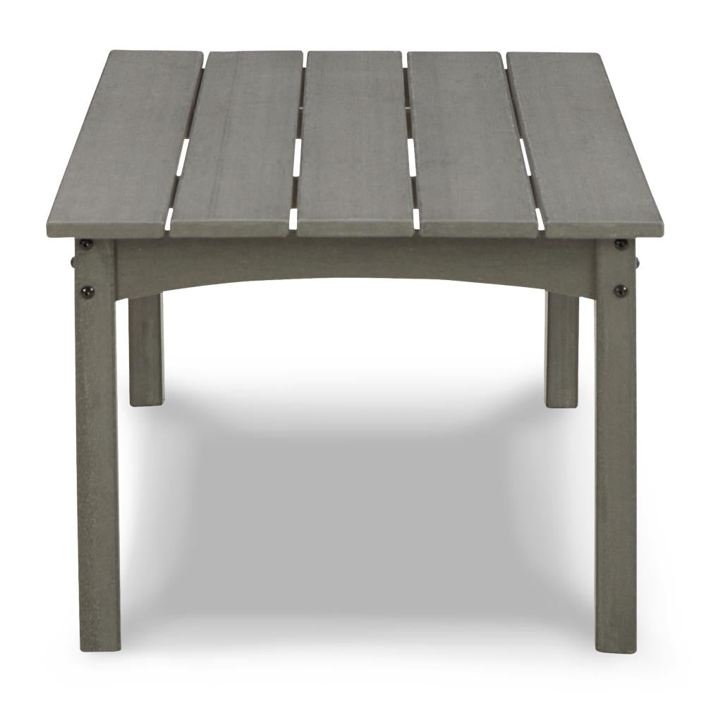 It’s the dawn of a new day for gray. Crafted of HDPE material that combines the exceptional durability and weather... It’s the dawn of a new day for gray. Crafted of HDPE material that combines the exceptional durability and weather resistance you need with the "wood look" you love, this timeless set takes al fresco living to a whole new level. Slatted styling on the table naturally sheds rainwater. The thick seat and back cushions on the chairs and loveseat are wrapped in the exclusive Nuvella® high-performance fabric that’s fade resistant, stain resistant, and a breeze to clean. This set includes an outdoor loveseat, 2 lounge chairs, and a coffee table. View more