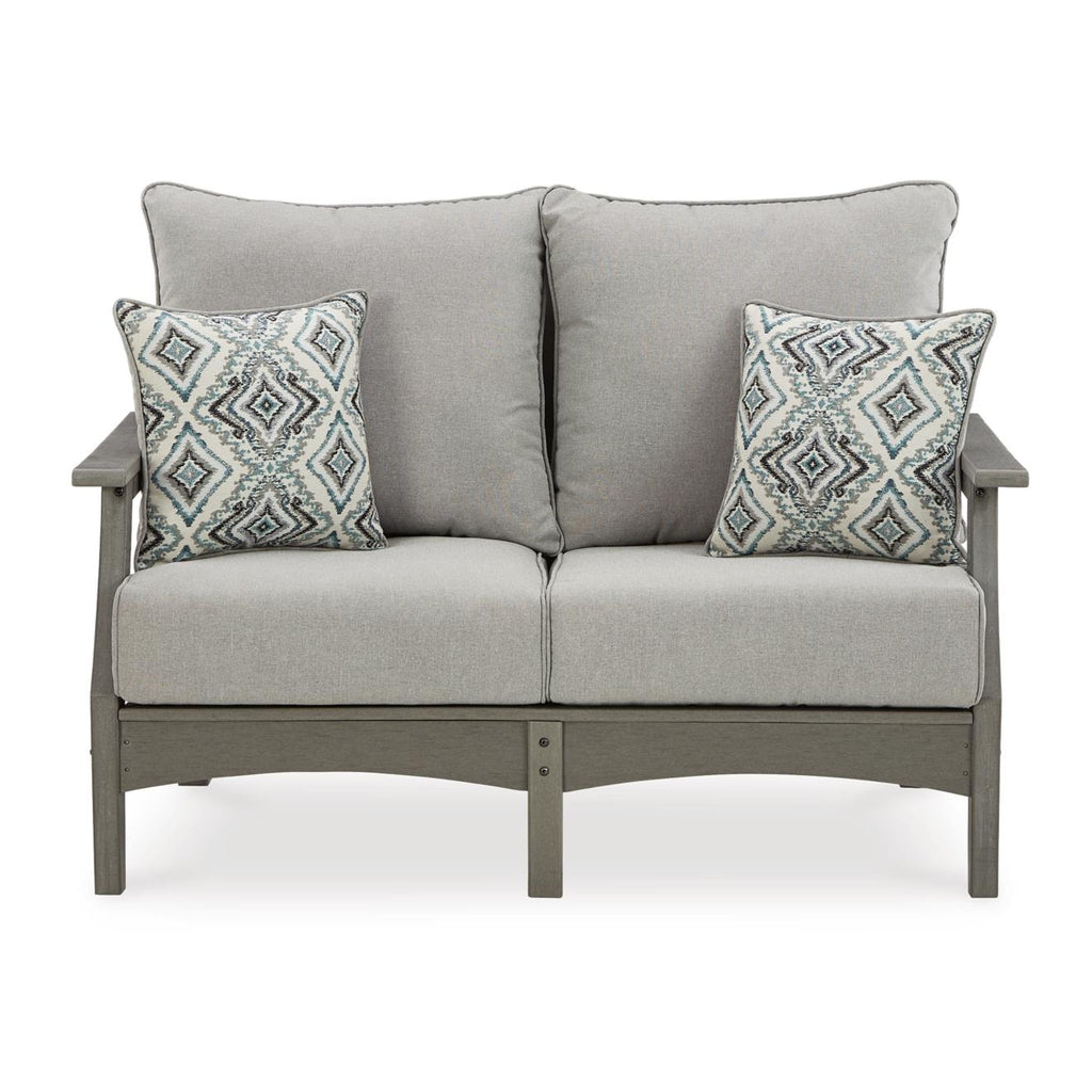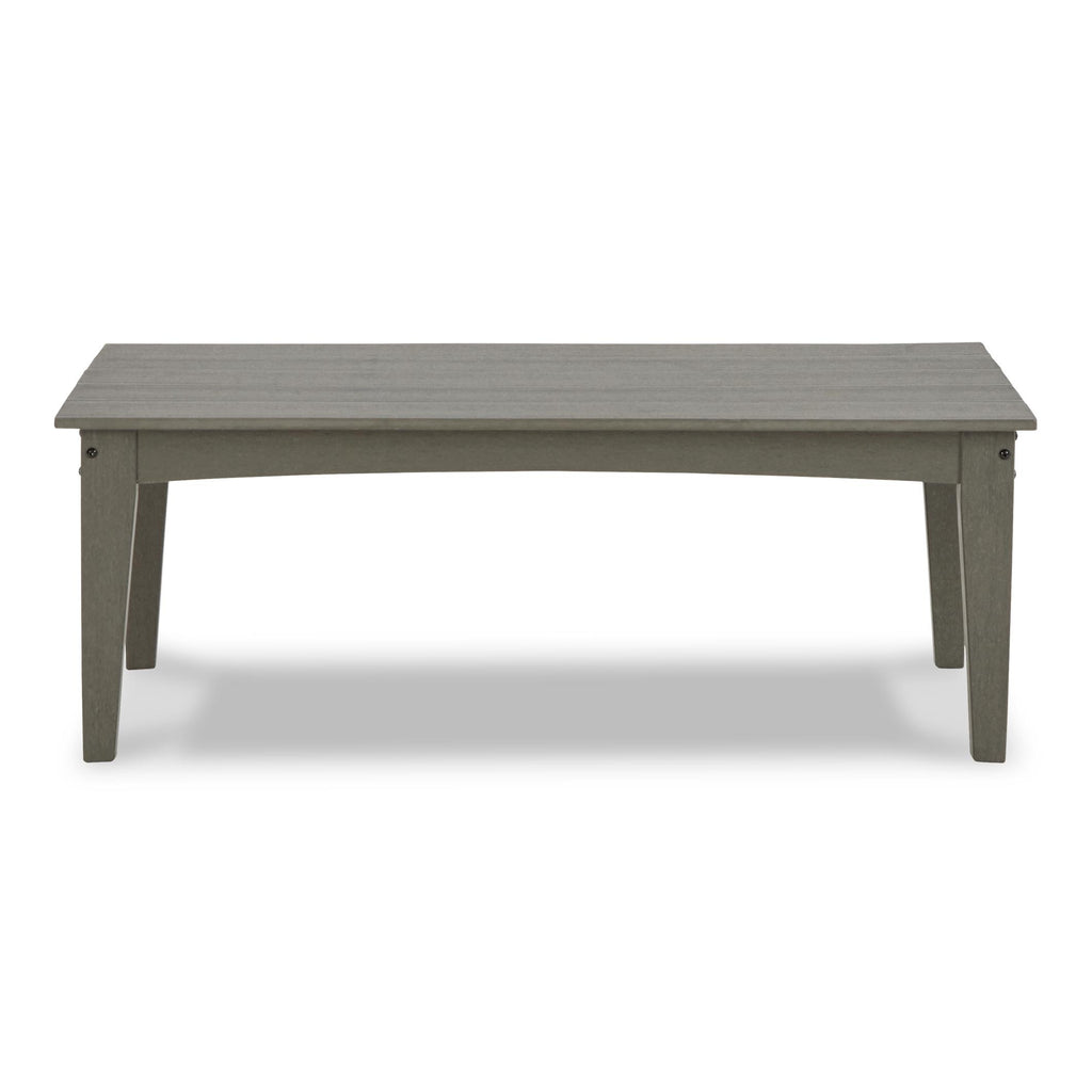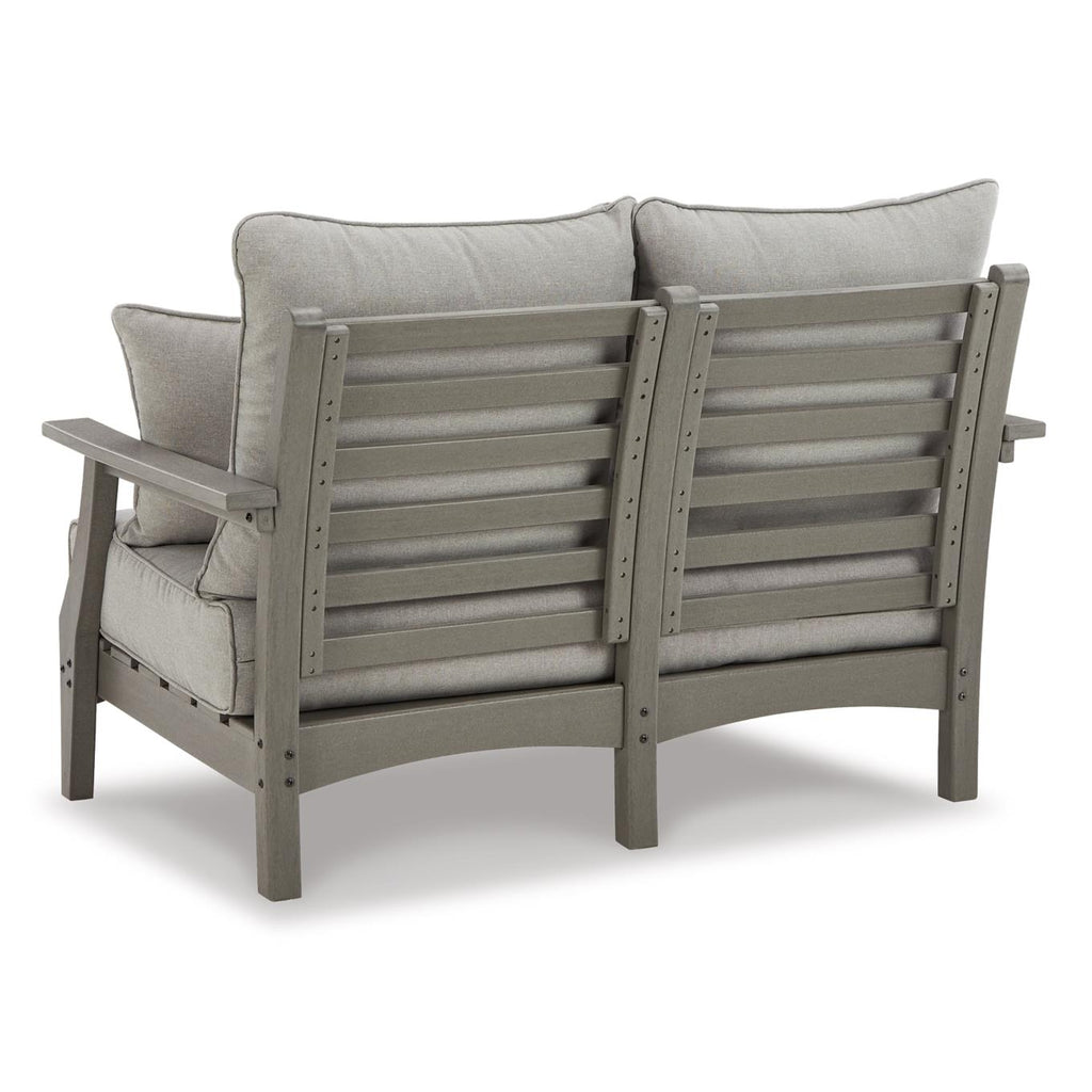 It’s the dawn of a new day for gray. Crafted of HDPE material that combines the exceptional durability and weather... It’s the dawn of a new day for gray. Crafted of HDPE material that combines the exceptional durability and weather resistance you need with the "wood look" you love, this timeless set takes al fresco living to a whole new level. Slatted styling on the table naturally sheds rainwater. The thick seat and back cushions on the chairs and loveseat are wrapped in the exclusive Nuvella® high-performance fabric that’s fade resistant, stain resistant, and a breeze to clean. This set includes an outdoor loveseat, 2 lounge chairs, and a coffee table. View more